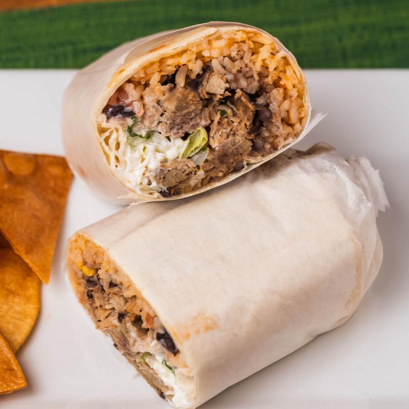 Choice of protein on white or whole wheat tortillas. Includes red Mexican rice, black beans, pico de gallo, sour cream, and chips and salsa.